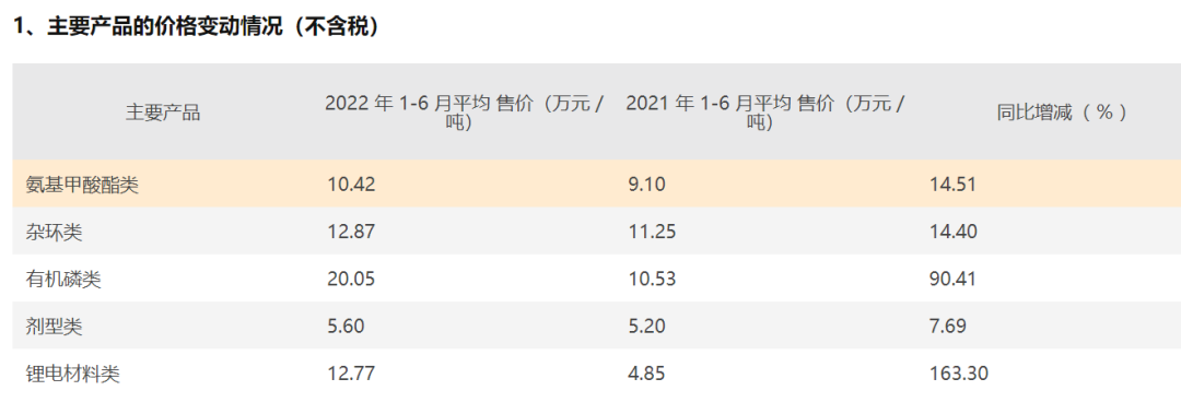 除了上述产能成倍提升外,公司主要产品价格都有不同程度上涨,湖南海利建有年产万吨规模的氨基甲酸酯类农药原药生产装置、年产万吨规模的有机磷农药生产装置等,主要产品涵盖氨基甲酸酯类、杂环类、有机磷类、剂型类、锂电材料类。对应今年1-6月平均售价同比分别增14.51%、14.40%、90.41%、7.69%、163.30%。