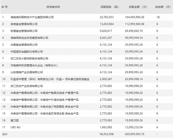 湖南海利:定增募资7亿元,诺德基金、财通基金、华夏基金等17家对象获配