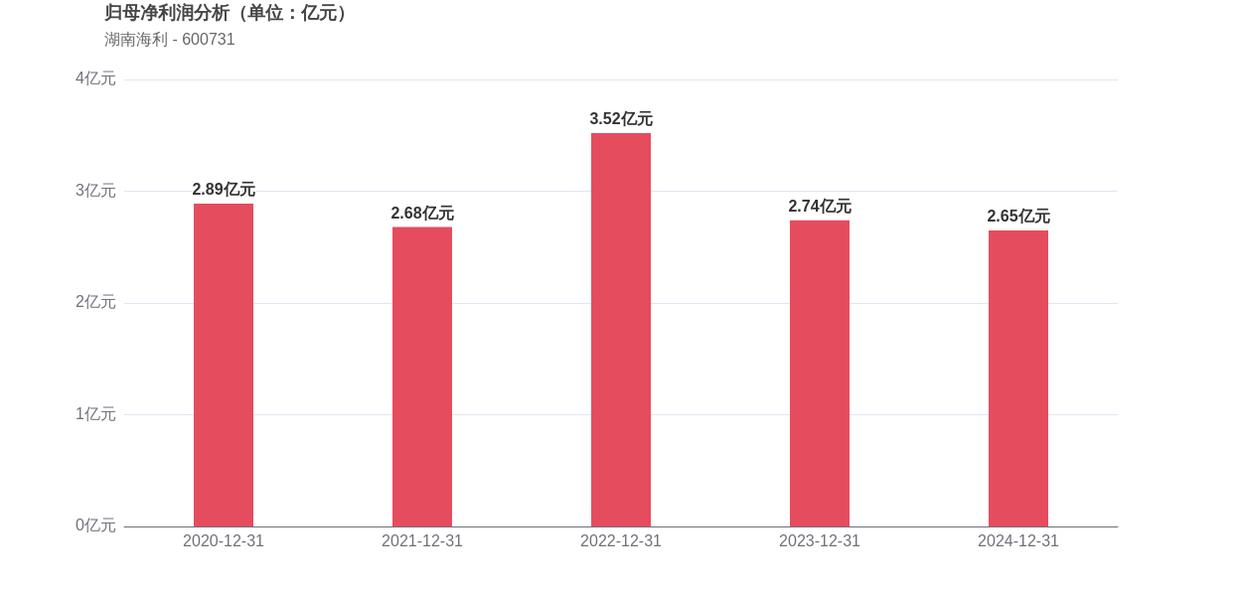 利润角度分析,2020年湖南海利实现归母净利润2.89亿元,2024年2.65亿元。近年来归母净利润波动明显,2020年大幅增长后,2021年和2023年出现下滑,整体呈现震荡走势。