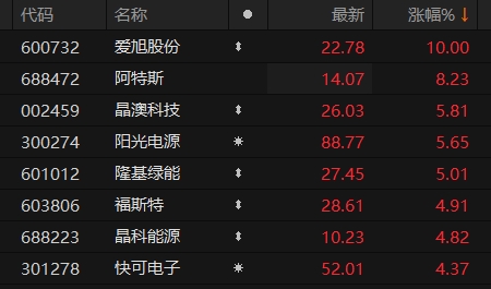 9月27日上午交易时段,A股太阳能概念股走高。10时13分,爱旭股份涨停,阿特斯涨超8%,晶澳科技、阳光电源、隆基绿能涨超5%。