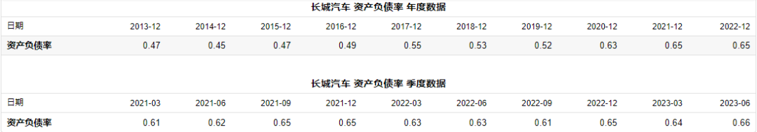 话虽如此,上半年长城汽车资产负债率高达66.15%,查阅价值大师历年年末统计发现,这个数据高于近十年末负债率。