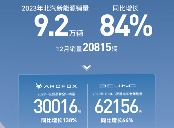 根据ARCFOX极狐官方微信公众平台发布的消息,北汽蓝谷旗下极狐汽车与BEIJING品牌电车2023年累计销量分别为30016辆和62156辆,同比分别增长138%和66%。