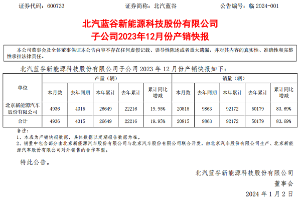 日前,北汽蓝谷(600733.SH)发布2023年12月产销快报,数据显示,北汽蓝谷子公司北京新能源汽车股份有限公司12月汽车销量为20815辆,同比增长111.04%;1-12月累计销量为92172辆,同比增长83.69%。