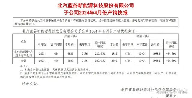 5月5日,北汽蓝谷发布销量公告,数据显示,4月北京新能源汽车股份有限公司销量2882辆,去年同期为4768辆,同比暴跌39.56%;今年累计销量13004辆,同比暴跌34.59%。