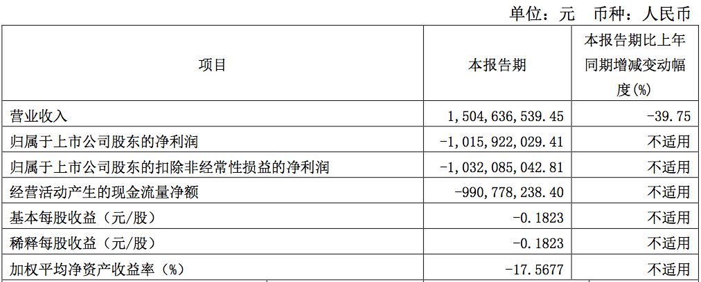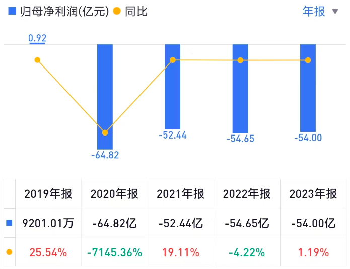 遗憾的是,其归属于上市公司股东的净利润(简称“归母净利润”)亏损额虽然较去年同期收窄1.19个百分点,但仍迎来了四年连亏,期内亏损达54亿元。