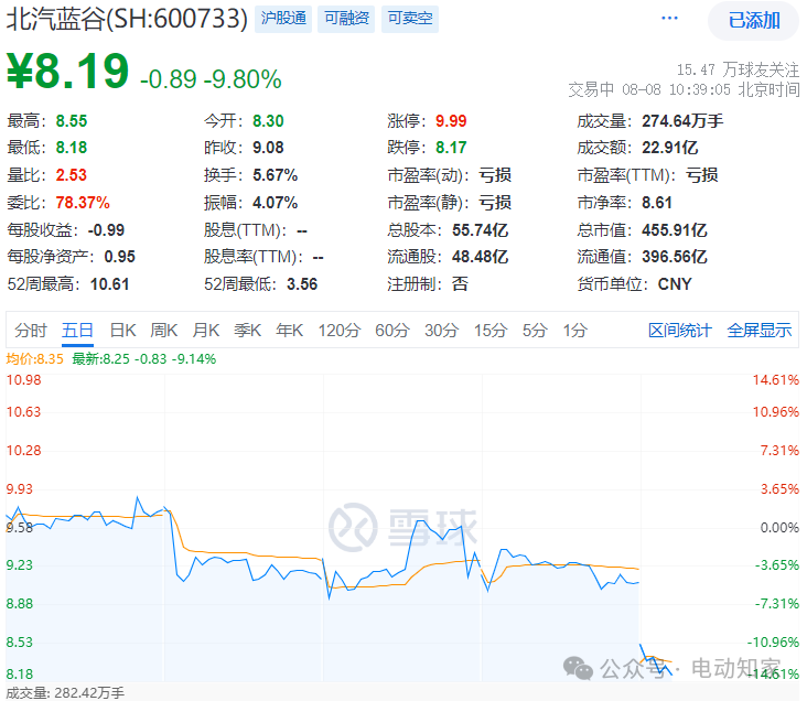 电动知家消息,8月8日上午,北汽蓝谷盘中暴跌9.8%。