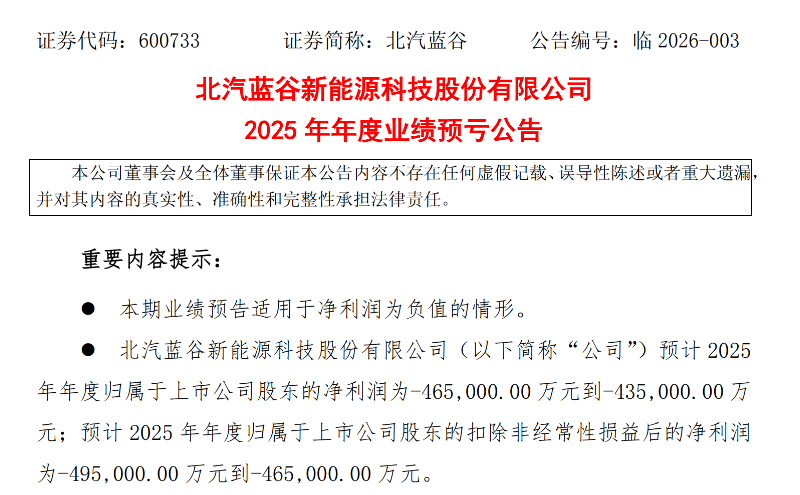 1月19日,北汽蓝谷发布公告称,公司预计2025年年度归属于上市公司股东的净利润为亏损43.5亿元至46.5亿元;预计2025年年度归属于上市公司股东的扣除非经常性损益后的净利润为亏损46.5亿元至49.5亿元。