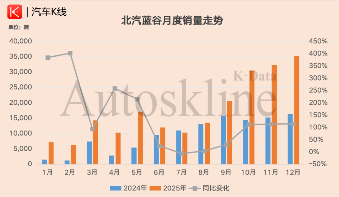 2025年,北汽蓝谷销量飙涨,全年销售新车20.96万辆,同比飙升84.06%。这样的表现,不仅刷新了北汽蓝谷借壳上市以来的最高销量,同时还跑赢了行业28.2%的销量增速。