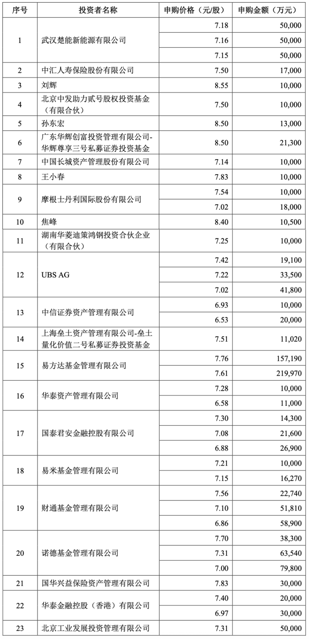 值得一提的是,参与此次认购的投资者达23名,其中不乏瑞银集团、中信证券、华泰资产、摩根士丹利、长城资产管理公司、国泰君安等国内外知名投资机构。