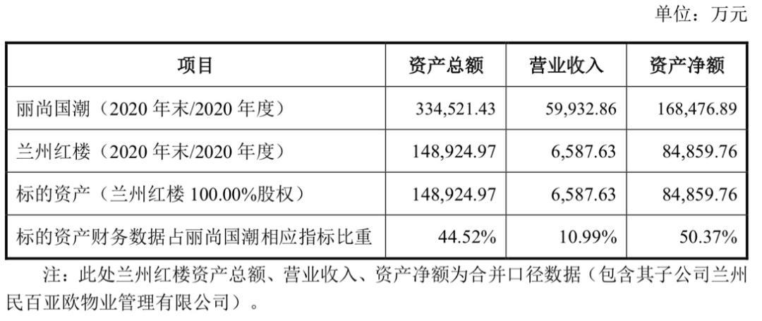公告显示,红楼房地产成立于2004年,主要从事兰州地区的商业地产开发运营。2010年,丽尚国潮通过股权受让的方式拥有了红楼房地产100%股权,红楼房地产成为该公司的全资子公司。