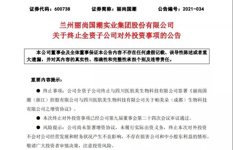 丽尚国潮并没有就此给予回复,而是于6月4日发布公告表示“将延期回复《问询函》”。18天之后,6月22日晚间,丽尚国潮宣布终止收购事项,进军医美计划在经历25天后告一段落。