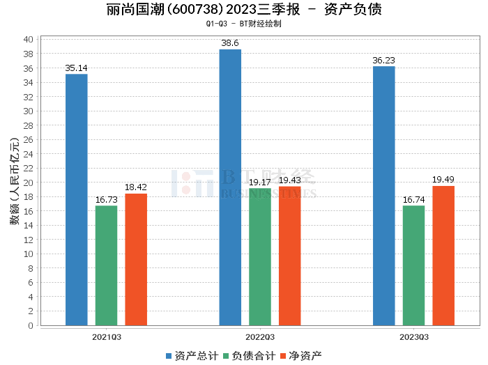 从资产负债方面来看,截至2023年三季度末,丽尚国潮的总资产为36.23亿元,相较于上年度末的36.6亿元略有下降。负债合计为16.74亿元,较上年度末的17.41亿元减少,这表明公司在负债管理上有所改善。净资产则从上年度末的19.19亿元增加到19.49亿元,资产负债率由47.58%降至46.21%,显示出公司的财务结构正在逐步优化。