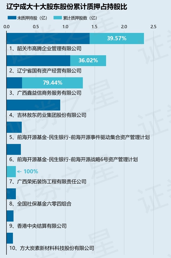 截止本公告日,股东韶关市高腾企业管理有限公司已累计质押股份9259.0万股,占其持股总数的39.57%,股东辽宁省国有资产经营有限公司已累计质押股份6120.0万股,占其持股总数的36.02%,股东广西鑫益信商务服务有限公司已累计质押股份1.04亿股,占其持股总数的79.44%,股东广西荣拓装饰工程有限责任公司已累计质押股份1611.0万股,占其持股总数的100.0%。本次质押后辽宁成大十大股东的累计质押股份占持股比例见下图: