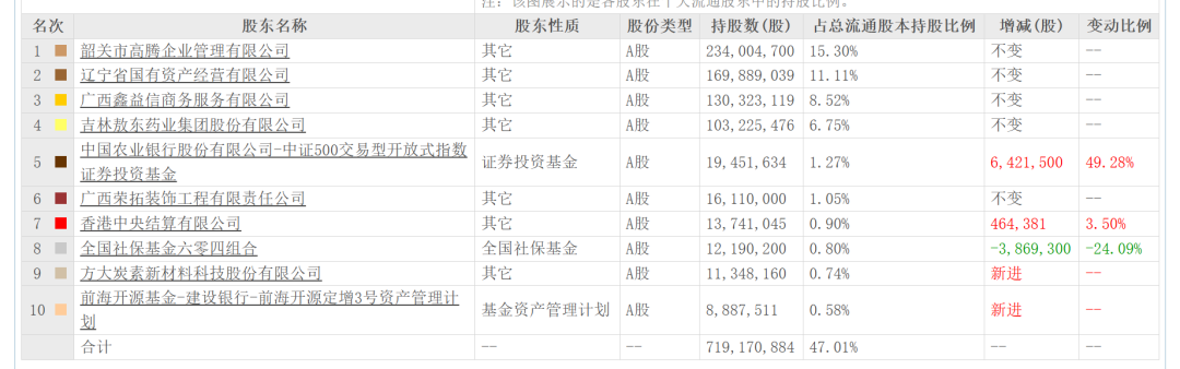 东方财富数据显示,除韶关高腾外,辽宁成大前十大股东还包括辽宁国资、广西鑫益信商务服务有限公司、吉林敖东等,分别持有11.11%、8.52%以及6.75%的股份。
