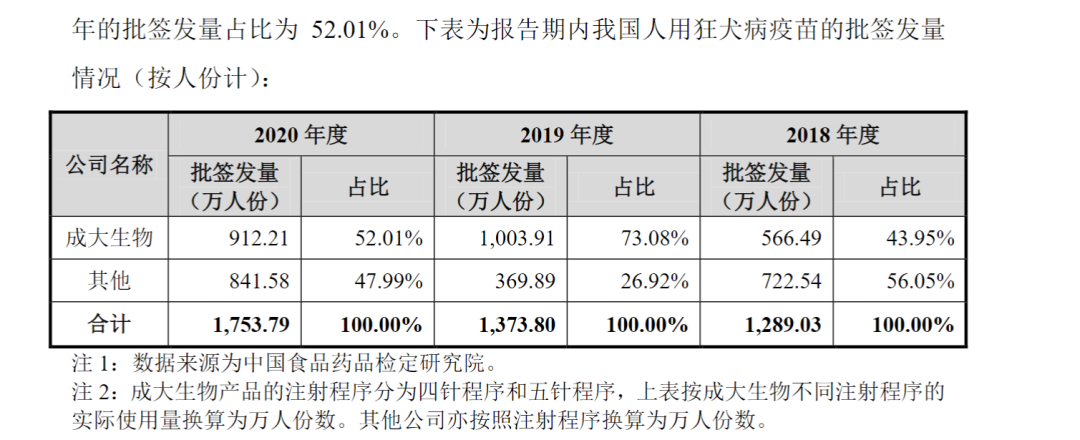 成大生物是国内人用狂犬疫苗领域的佼佼者,2018年至2020年间,成大生物人用狂犬病疫苗批签发市占率分别为43.95%、73.08%、52.01%。