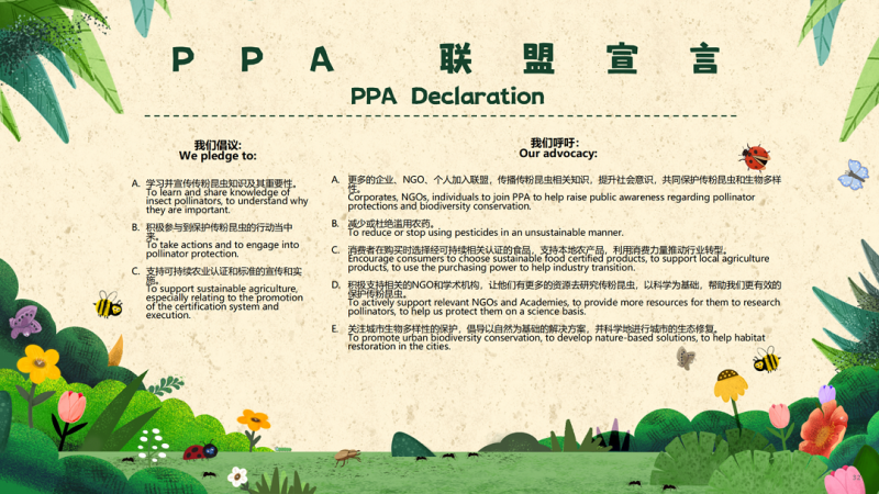 PPA创立于2022年12月20日(世界野生动植物日),由彩色星球、道朗格、中国企业财务管理协会ESG(环境、社会、治理)分会、雨林联盟联合40多家单位发起,立足地球生物多样性视角,以传粉昆虫保护为切入点,聚合学界、产业界等多方力量和资源,守护传粉昆虫,保护生物多样性,以行动诠释可持续发展。