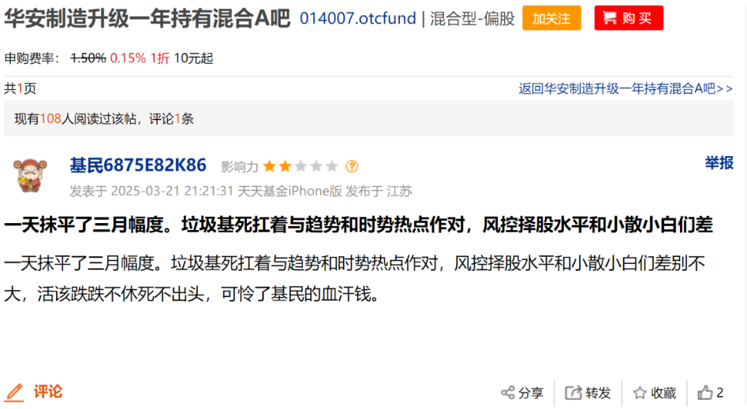 一天抹平了三月幅度,这死扛着与趋势和时势热点作对,风控择股水平和小散小白们差别不大,活该跌跌不休死不出头,可怜了基民的血汗钱。甚至有基民表示,华安公司居然还能让这货管理基金,下岗此类严重不称职的,反之砸了牌子。