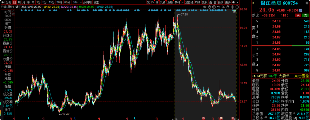 笔者还发现,该基金在2023年2季度买入49.34万股的锦江酒店,2023年3季度加仓至66.79万股,2023年4季度继续加仓至86.43万股。2024年1季度继续加仓至97.24万股,2024年2季度持有97.24万股,2024年3季度持有98.01万股,2024年4季度继续加仓至112.30万股,2025年1季度持有112.30万股。然而,在该基金持有期间,在2023年4月3日-2025年5月23日股票价格下跌了62%。