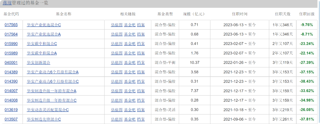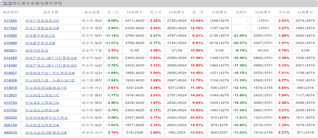 笔者发现,目前蒋经理旗下在管基金有9只,但总体业绩并不理想,短周期产品业绩出现回正,但长周期来看仍处于亏损状态。尤其是近2年来仍有8只基金出现亏损,其中业绩亏损最大的是华安碳中和混合A/C,其收益率-20.47%、-21.45%。