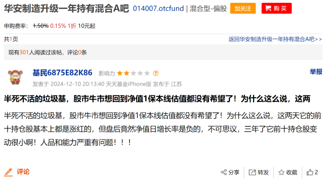 业绩亏损,有基民抱怨道,半死不活的垃圾基,股市牛市想回到净值1保本线估值都没有希望了!为什么这么说,这两天它的前十持仓股基本上都是涨红的,但盘后竟然净值日增长率是负的,不可思议,三年了它前十持仓股变动很小啊!人品和能力严重有问题!!!