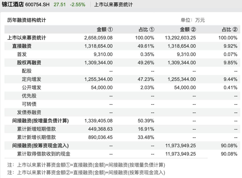 据Wind统计,A股上市以来,锦江酒店直接融资(首发、定向增发、公开增发)131.87亿元,间接融资(按筹资现金流入)1197.39亿元,募资总额合计1329.26亿元。