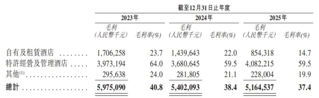 期内,锦江酒店毛利率分别为40.8%、38.4%、37.4%,三年下滑3.4个百分点。2025年,自有及租赁酒店毛利率为14.7%;特许经营及管理酒店毛利率为59.5%,是前者的4倍多。