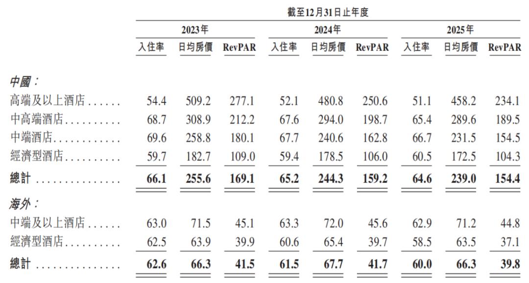 2025年,锦江酒店国内酒店板块日均房价为239元,较2023年下降16.6元,降幅6.49%;RevPAR为154.4元,较2023年下降14.7元,降幅8.69%。