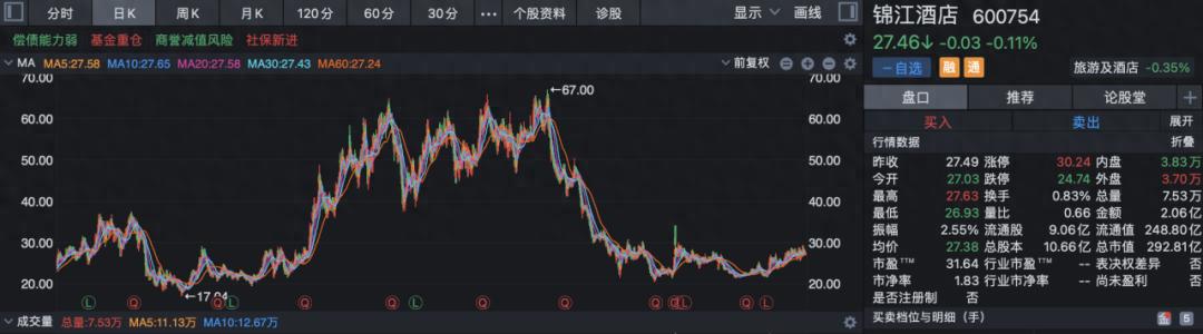 截至4月13日收盘,锦江酒店A股股价为27.46元/股,总市值292.81亿元。