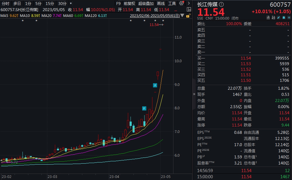 据公告,长江传媒4月27日、4月28日、5月4日连续三个交易日内日收盘价格涨幅偏离值累计超过20%,属于股票交易异常波动。Wind数据显示,长江传媒近期股价表现强劲,该股从2月27日收盘5.75元/股一路上涨,并在4月27日、28日以及5月4日、5日连续涨停,斩获四连板,股价也快速抬升至5月5日收盘价11.54元/股,区间涨幅超过100%。