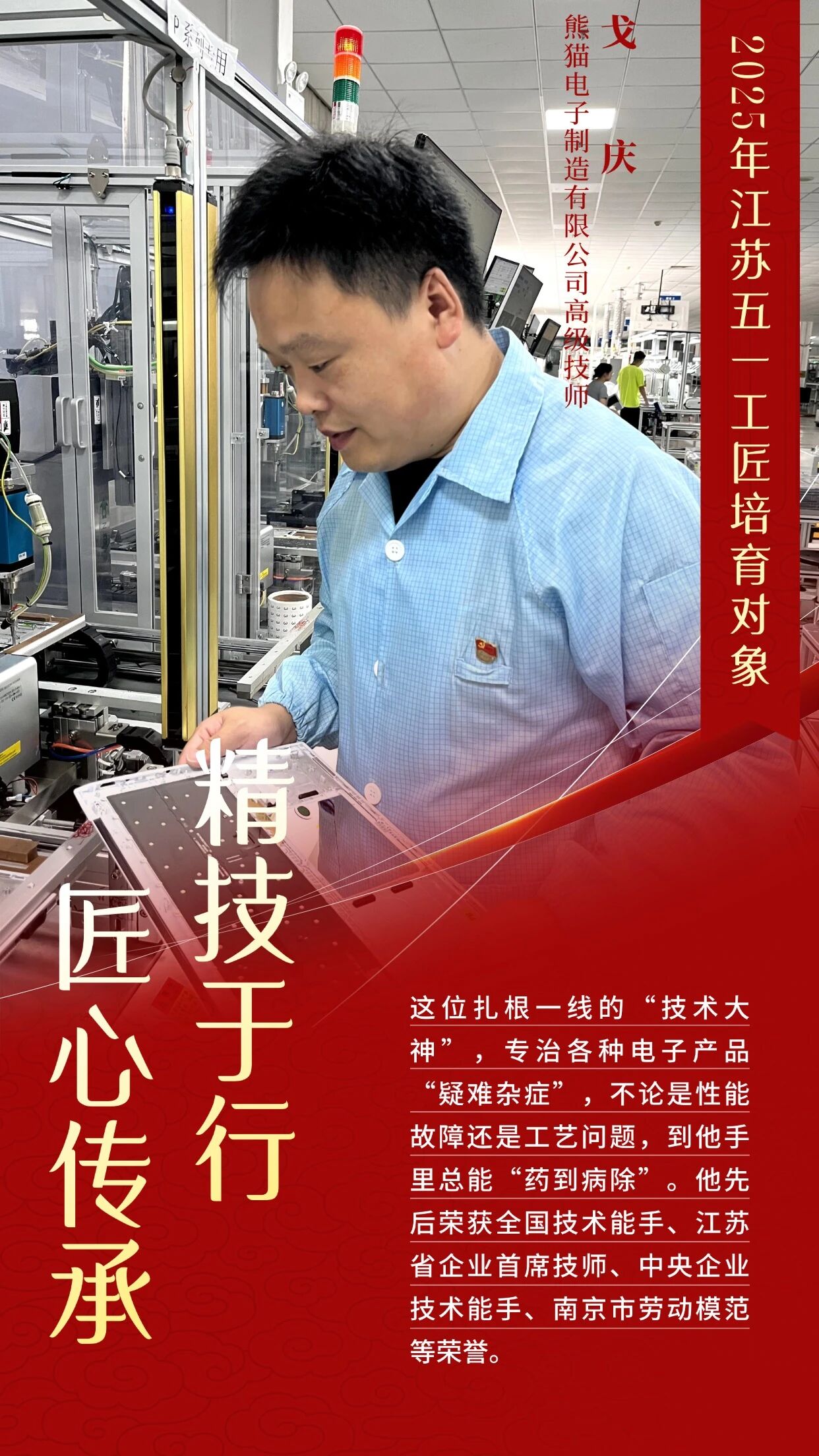 江苏省总工会公布2025年江苏五一工匠培育对象名单,熊猫制造高级技师戈庆成功入选,成为重点培育工匠人才之一。