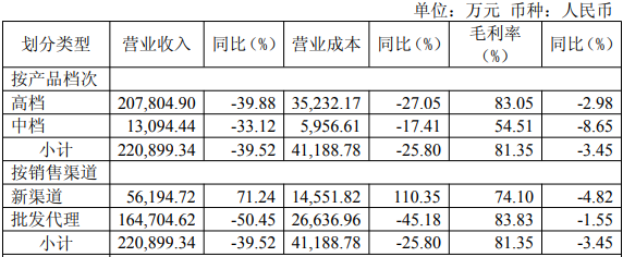 值得注意的是,水井坊延续“去低端化”策略,停止低档产品供货,聚焦典藏、井台等高毛利核心系列,但高端酒的营收、毛利率仍在同比下滑,从政角度看,“去低端化”策略效果并不明显。
