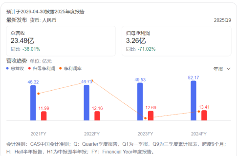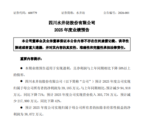 昨日晚间,“川酒六朵金花之一”水井坊发布2025年业绩预告。公告显示,水井坊预计2025年实现营业收入为30.38亿元,同比下降42%,实现归母净利润为3.92亿元,同比下降71%,扣非后归母净利润3.81亿元,同比下降71%。