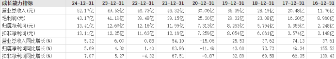 2016年-2024年,水井坊实现营收分别为11.76亿元、20.48亿元、28.19亿元、35.39亿元、30.06亿元、46.32亿元、46.73亿元、49.53亿元和52.17亿元,同比增长分别为37.61%、74.13%、37.62%、25.53%、-15.06%、54.10%、0.88%、6.00%和5.32%;归母净利润分别为2.248亿元、3.355亿元、5.794亿元、8.263亿元、7.313亿元、11.99亿元、12.16亿元、12.69亿元和13.41亿元,同比增长分别为155.52%、49.24%、72.72%、42.60%、-11.49%、63.96%、1.40%、4.36%和5.69%。