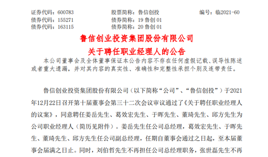 22日,鲁信创业投资集团股份有限公司(鲁信创投. 600783.SH)公告,公司董事会会议审议通过《关于聘任职业经理人的议案》,同意聘任姜岳、葛效宏、于晖、董琦、邱方为公司职业经理人。姜岳任公司总经理,葛效宏、于晖、董琦、邱方任公司副总经理,任期自董事会通过之日起,至本届董事会届满之日止。同时,刘伯哲不再担任鲁信创投总经理职务,张世磊不再担任副总经理职务。