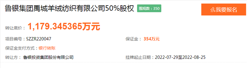 日前,鲁银投资集团股份有限公司(鲁银投资.600784.SH)于山东产权交易中心发布信息称,拟以1179.35万元公开挂牌转让全资子公司鲁银集团禹城羊绒纺织有限公司(简称“禹城羊绒”)50%股权,挂牌期截至8月25日。针对此次转让,鲁银投资表示本次股权转让后,将不放弃对禹城羊绒的实际控制权。