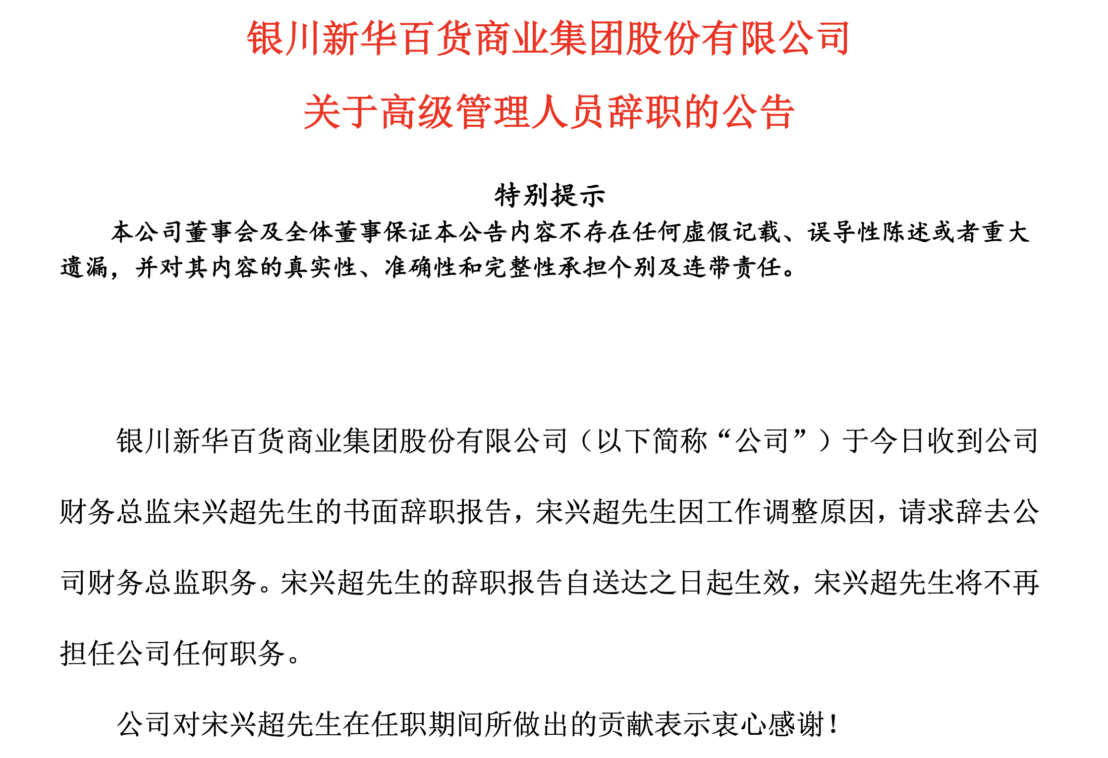 9月17日,新华百货发布公告称,宋兴超因工作调整原因,请求辞去财务总监职务。辞职后,宋兴超将不再担任该公司任何职务。