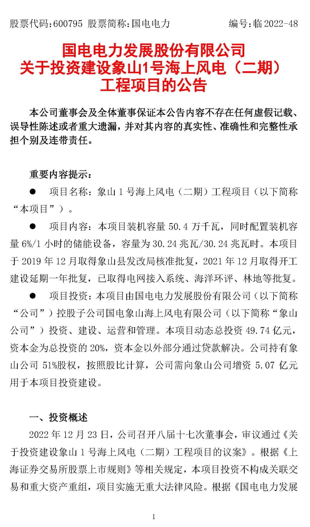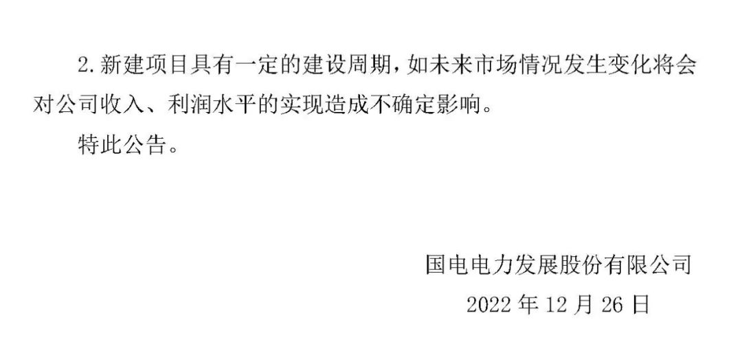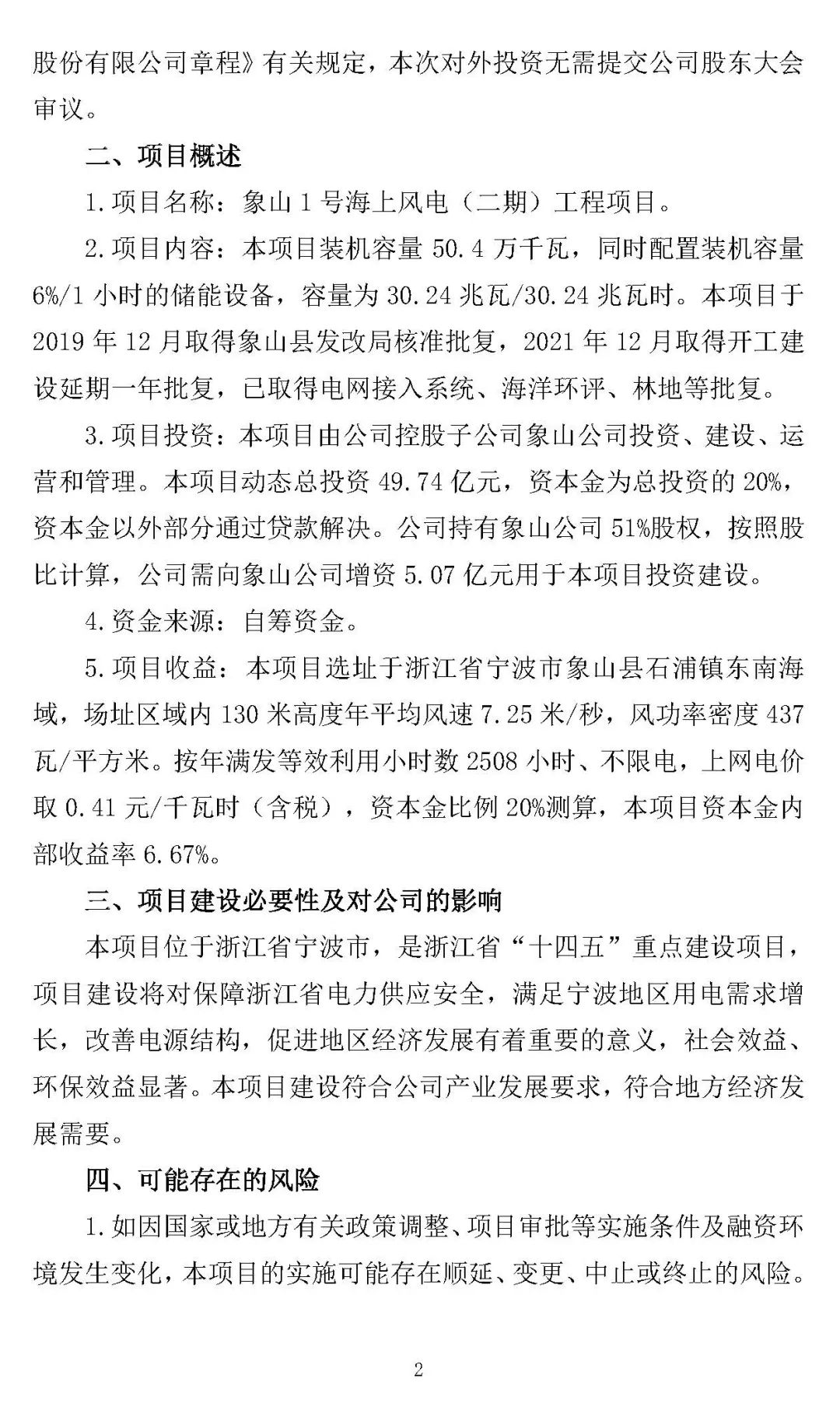 12月25日,国电电力发布公告,公司控股子公司象山公司拟投资、建设、运营和管理象山1号海上风电(二期)工程项目,该项目动态总投资49.74亿元。本项目是浙江省“十四五”重点建设项目,项目建设将对保障浙江省电力供应安全,满足宁波地区用电需求增长。