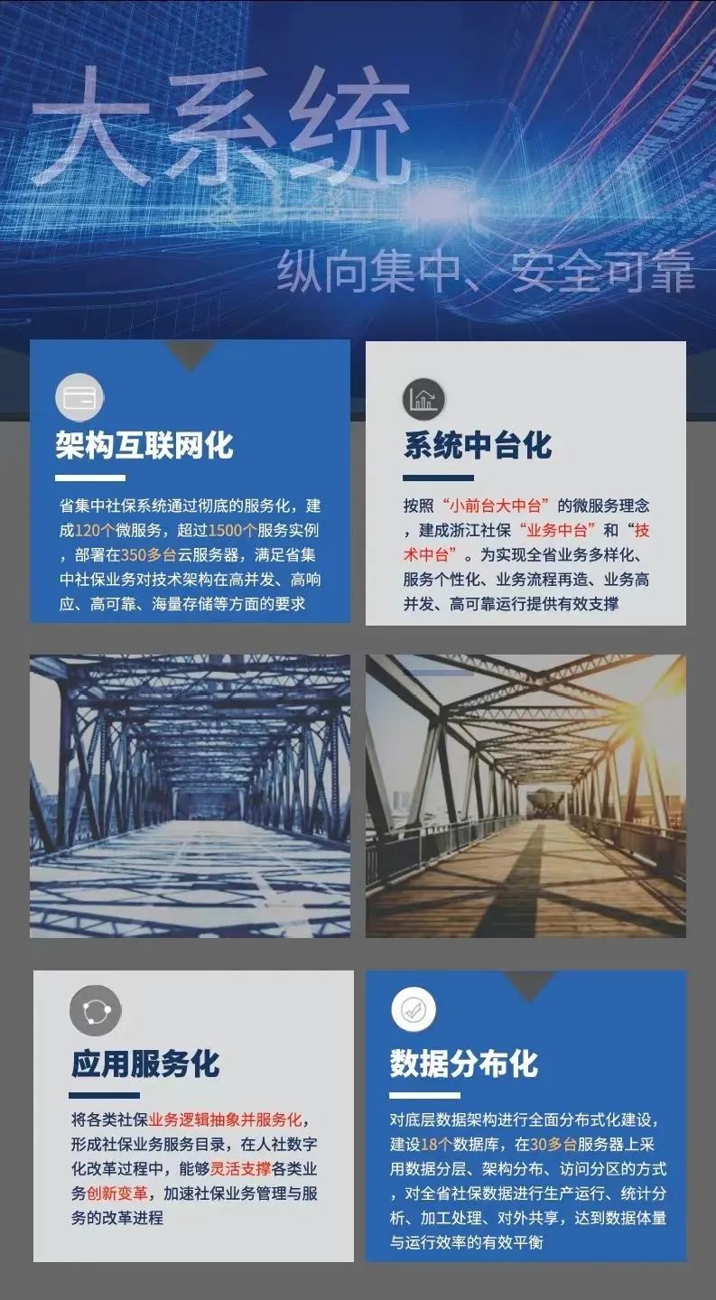 浙江省社保信息系统省集中项目建设历时1年零8个月,覆盖企业职工养老保险、工伤保险、失业保险、城乡居民社会养老保险、工伤认定和劳动能力鉴定等业务,通过深度融合各个业务板块功能,实现业务、财务、档案、风控一体化,全省社会保险业务经办“一个系统”、社保服务事项“一网通办”。