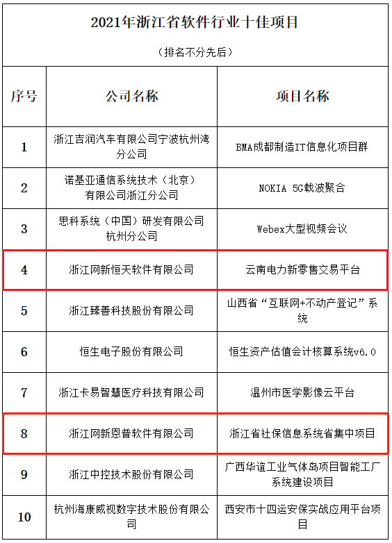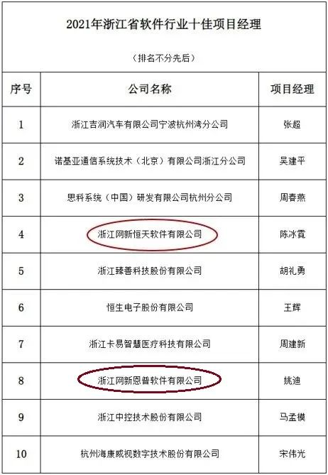 4月8日,浙江省软件行业协会公示2021年浙江省软件行业优秀项目管理案例和优秀项目经理评选结果,浙大网新旗下子公司恒天软件与网新软件(原名网新恩普)双双入选,其中恒天软件的云南电力新零售交易平台荣获浙江省软件行业十佳项目,项目技术负责人陈冰霓荣获十佳项目经理;网新软件的浙江省社保信息系统省集中项目荣获浙江省软件行业十佳项目,项目总监姚迪获评十佳项目经理。