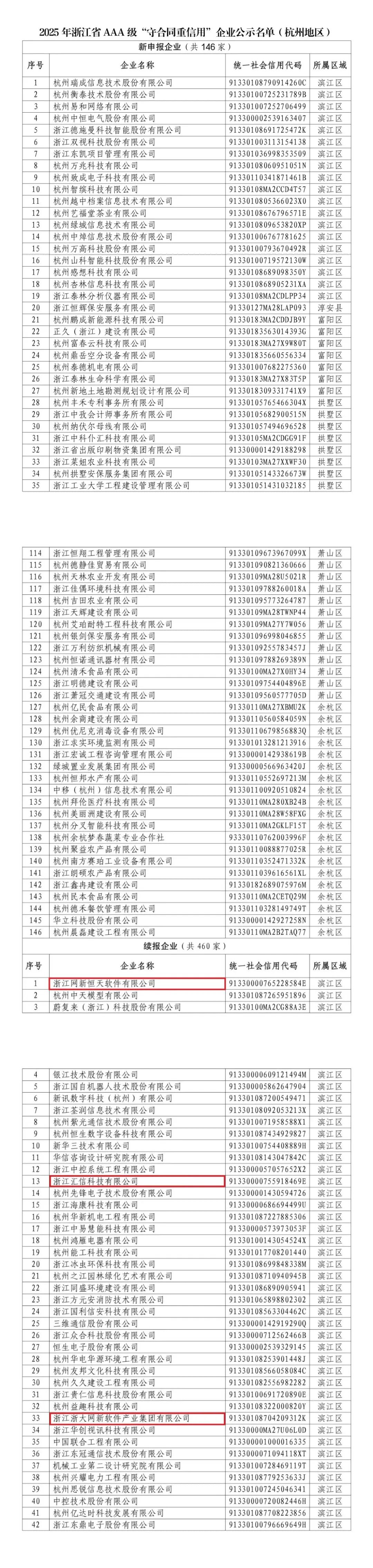 近日,浙江省市场监管局公布2025年度全省AAA级“守合同重信用”企业名单,杭州市606家企业上榜,含新公示企业146家,继续公示企业460家。其中,浙大网新旗下三家子公司——网新恒天、汇信科技、网新软件均成功入选,再次荣获浙江省AAA级“守合同重信用”企业认定。
