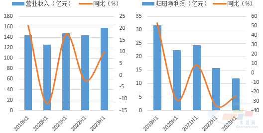 图1、2:2023年上半年华新水泥营业收入增加、归母净利润下降