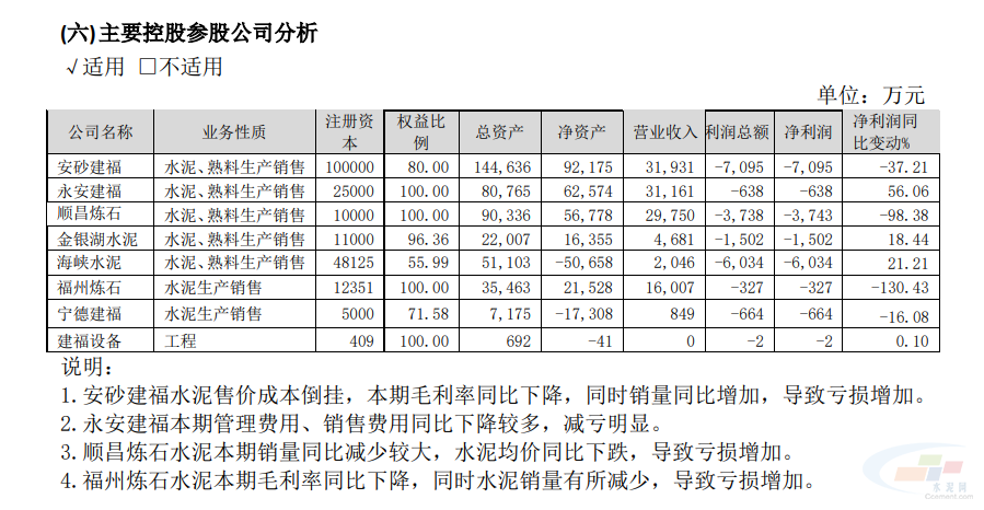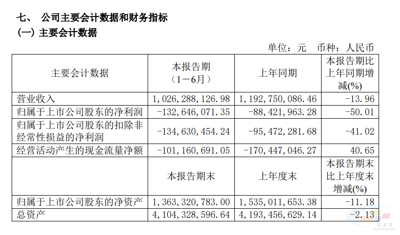 8月21日,福建水泥发布2023年半年度报告。报告期内,1-6月福建水泥营业收入1,026,288,126.98元,去年同期1,192,750,086.46元,同比下降13.96%;归属于上市公司股东的净利润为-132,646,071.35元,去年同期-88,421,963.28元,同比下降50.01%;归属于上市公司股东的扣除非经常性损益的净利润-134,630,454.24元,同比下降41.02%。