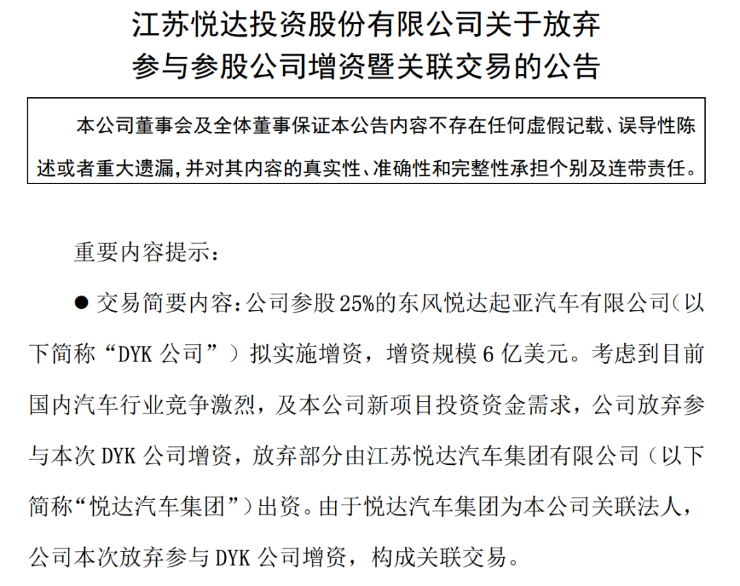 3月1日,悦达投资发布了《关于放弃参与参股公司增资暨关联交易的公告》。悦达投资在《公告》中表示,公司参股25%的东风悦达起亚汽车有限公司拟实施增资,增资规模6亿美元,但由于公司新项目投资资金需求,拟放弃参与东风悦达起亚公司的增资,放弃部分由江苏悦达汽车集团有限公司增资。