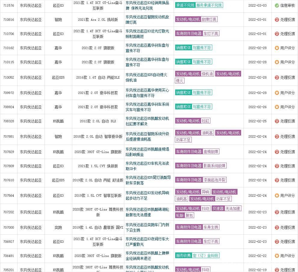 在汽车投诉网站车质网,起亚旗下多款车型均有投诉,K3、K5、KX5、智跑悉数上榜,甚至刚刚上市不久的嘉华也有不少投诉。这些车型被投诉的内容主要有“服务承诺不兑现、销售欺诈、发动机故障灯亮、发动机烧机油、发动机熄火、发动机拉缸、发动机油耗高、发动机异响、变速器无法加速、车身生锈、车灯不亮”等。