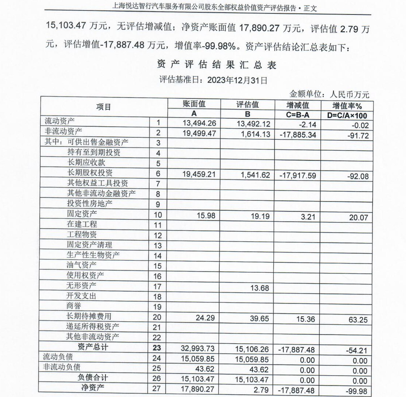 悦达投资公告称,江苏华信资产评估有限公司(以下简称江苏华信)以2023年12月31日为基准日,对悦达智行公司100%股权涉及的股东全部权益采用资产基础法进行了评估,出具了评估报告,评估结论为:悦达智行公司的股东全部权益在评估基准日2023年12月31日的市场价值为2.79万元,较其合并报表归属于母公司净资产﹣500.74万元增值503.53万元。