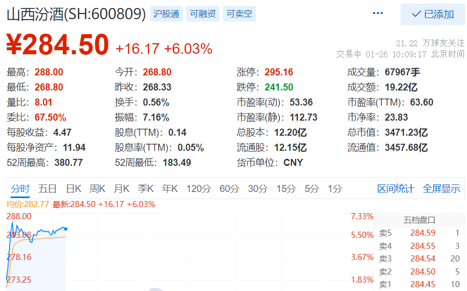 1月26日,截至10:09,山西汾酒(SH:600809)涨6.03%,现报284.50元,成交额为19.22亿元,总市值为3471.23亿元。