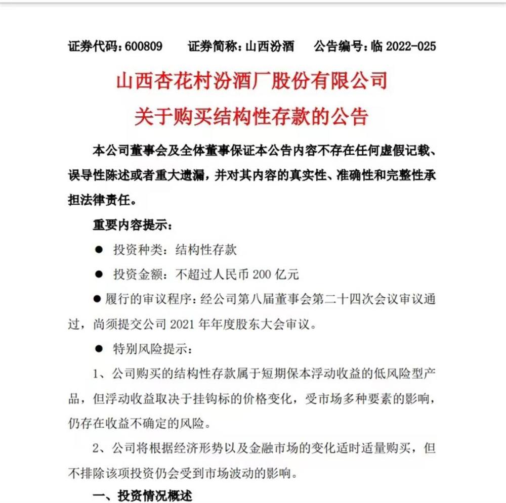 5月17日,山西杏花村汾酒厂股份有限公司(简称“山西汾酒”)发布公告称,拟以不超过200亿元的闲置自有资金购买安全性高、流动性好、低风险的结构性存款。