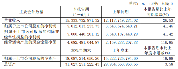 8月25日,山西汾酒发布2022年半年度报告,上半年企业实现营业收入153.34 亿元,同比增长26.53%,归属于上市公司股东的净利润50.13 亿元,同比增长41.46%。其中汾酒系列销售141.96万元;竹叶青酒系列销售5.48万元;杏花村酒系列销售4.83万元。