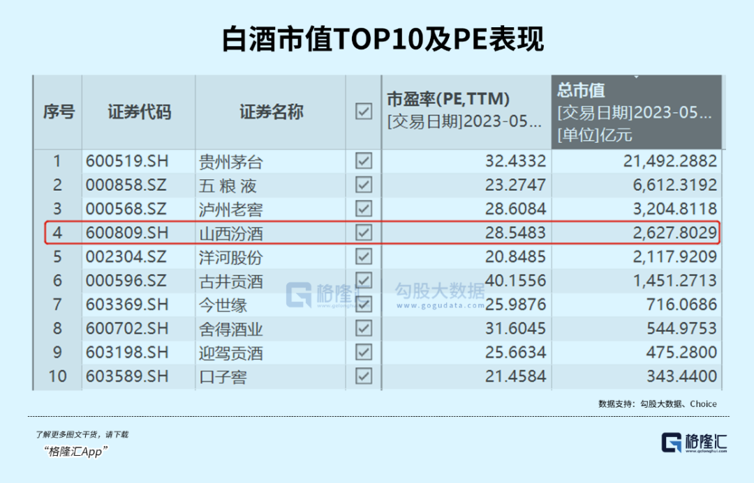 目前,山西汾酒市值位列所有A股白酒第4名。PE-TTM为28.5倍,较2021年2月18日的147倍大幅收窄。现有估值与同行相比,略低于茅台,与泸州老窖相差不大,但比五粮液、洋河股份还要高出不少。