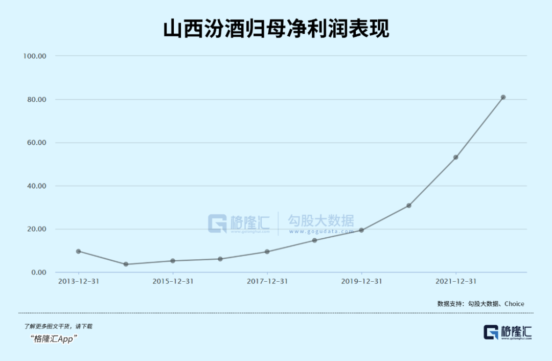 事后看,汾酒业绩表现大超此前预期。2017-2022年,营收规模从63.6亿元暴增至260亿元,归母净利润从9.44亿元暴增至80.96亿元。其利润同比增速分别为56.02%、55.36%、32.16%、58.85%、72.56%、52.36%。